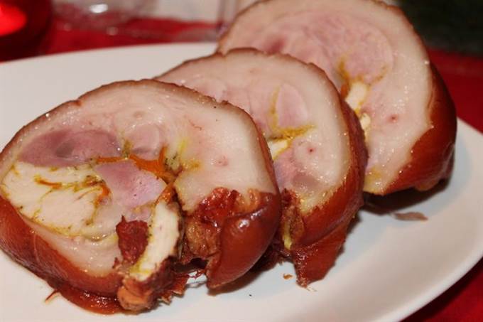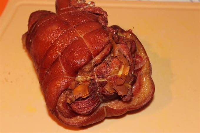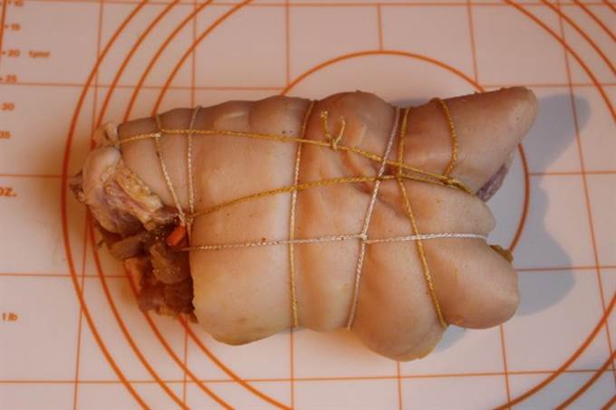 Рульку моем, зачищаем шкурку. Разрезаем и удаляем кость. Мясо слегка отбиваем. Лишнее мясо можно срезать, чтобы легче было свернуть рульку. Солим, перчим и натираем выдавленным чесноком.
