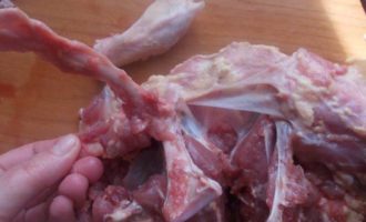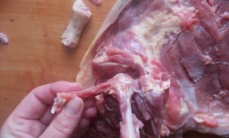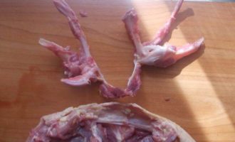 • Также вырезаем кость с ножек, обрубаем кончик и выворачиваем во внутрь, срезая ножом мясо, которое мешает.