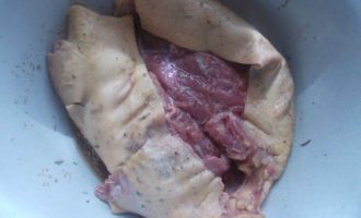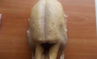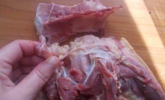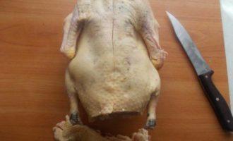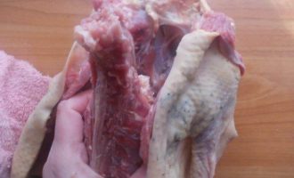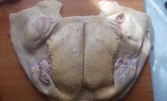 • Мясо вынуть из маринада и обсушить салфеткой. Там, где мяса больше, например в области грудки, срезать немного и эти кусочки положить там, где мяса нет, а больше кожи.