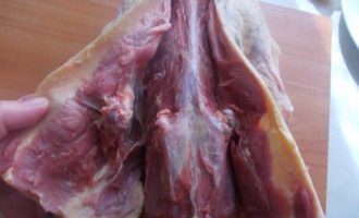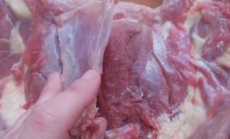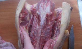 • Аккуратно, острым ножом, начинаем срезать мясо с каркаса. Будьте осторожны, кожа должна остаться целой.