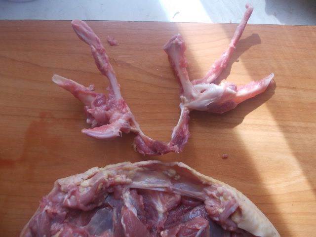 • Также вырезаем кость с ножек, обрубаем кончик и выворачиваем во внутрь, срезая ножом мясо, которое мешает.