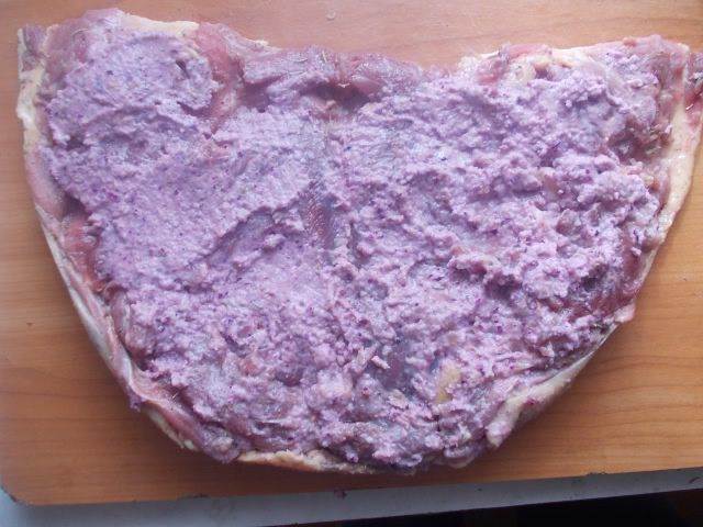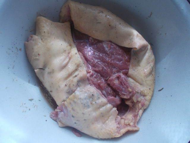 • Мясо вынуть из маринада и обсушить салфеткой. Там, где мяса больше, например в области грудки, срезать немного и эти кусочки положить там, где мяса нет, а больше кожи.