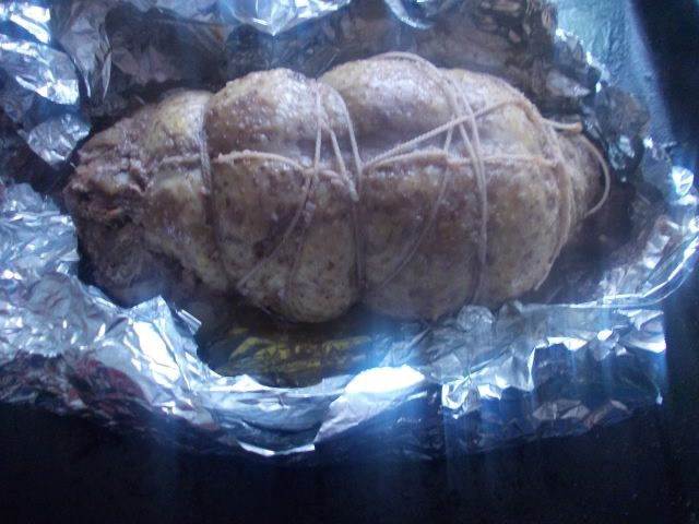 • И перевязать ниткой, завернуть в несколько слоев фольги. Запекать около 1.5 часа, при 180°C.