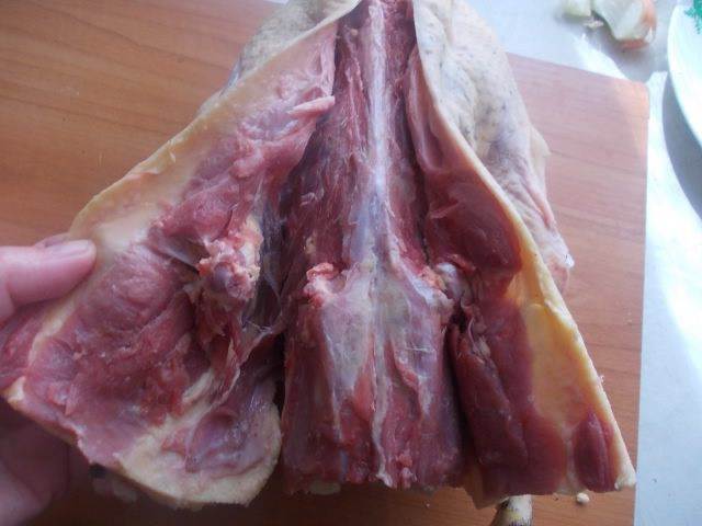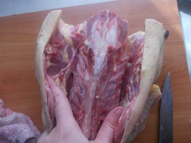 • Аккуратно, острым ножом, начинаем срезать мясо с каркаса. Будьте осторожны, кожа должна остаться целой.