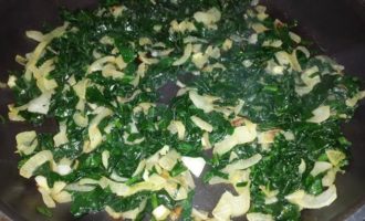 Добавила к шпинату лук с чесноком, посолила, перемешала и потушила еще 2 минуты. Выключила огонь и отставила в сторону остывать.