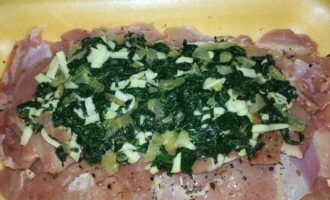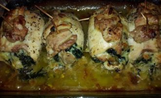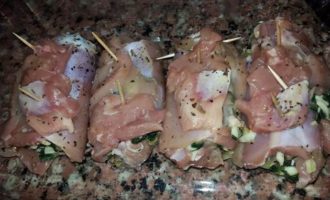 Далее на внутреннюю сторону бедра (чтобы волокнистая плотная часть была снаружи) выложила начинку. Она пластичная поэтому я прижала её пальцами к мясу хорошенько и свернула рулетиками закрепив зубочистками.