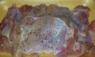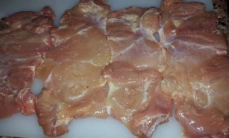 Куриные бедра без косточки мне разрезали для рулетиков и отбили в мясной лавке. Дома я просто помыла их и обрезала жир.