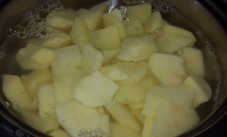 Картофель очистила, произвольно нарезала, залила водой, посолила и поставила варить.