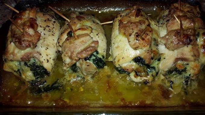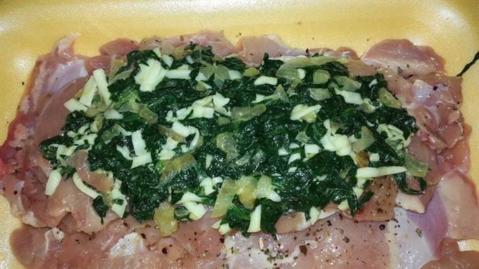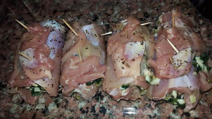 Далее на внутреннюю сторону бедра (чтобы волокнистая плотная часть была снаружи) выложила начинку. Она пластичная поэтому я прижала её пальцами к мясу хорошенько и свернула рулетиками закрепив зубочистками.