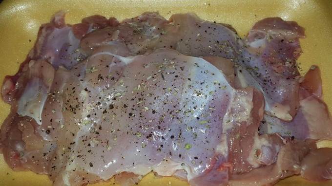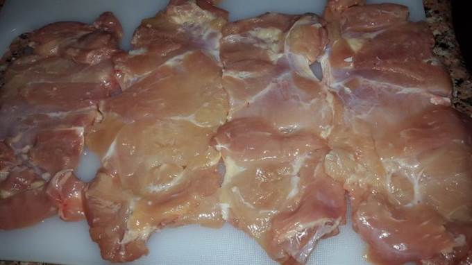 Куриные бедра без косточки мне разрезали для рулетиков и отбили в мясной лавке. Дома я просто помыла их и обрезала жир.