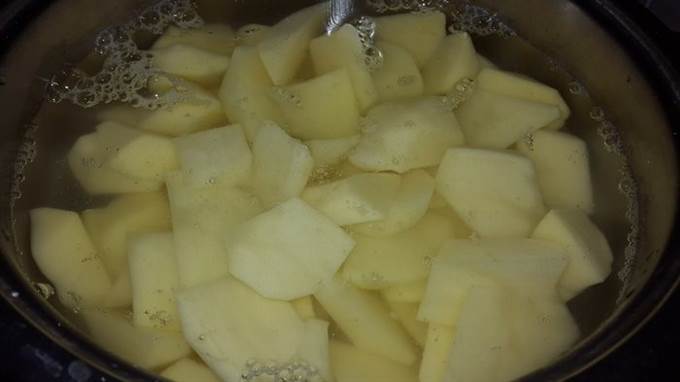 Картофель очистила, произвольно нарезала, залила водой, посолила и поставила варить.