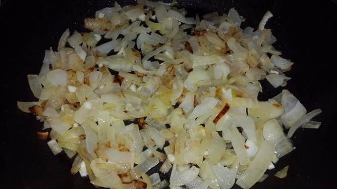 Лук нарезала и обжарила на сливочном масле до золотистого цвета, добавила к нему мелко нарубленный чеснок, обжарила еще 2 минуты.