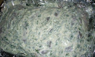 Сворачиваем все рулетиком и выкладываем в форму для запекания. Если у вас обычная, рекомендую ее предварительно выстелить фольгой в 2 слоя.