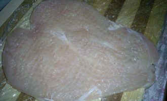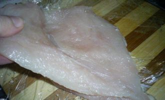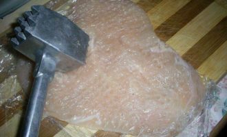 Теперь нам надо слегка отбить мясо. Удобно это сделать с помощью пищевой пленки. Застилаем разделочную доску пищевой пленкой, кладем подготовленное филе, накрываем пищевой пленкой и отбиваем его молотком.