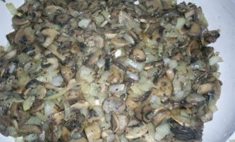Для начала приготовим начинку. Для этого шампиньоны моем, режем на пластинки, кладем на сковороду и жарим до испарения жидкости. Затем добавляем растительное масло, мелко нарезанный лук и жарим до готовности лука. Солим по вкусу и оставляем остывать.