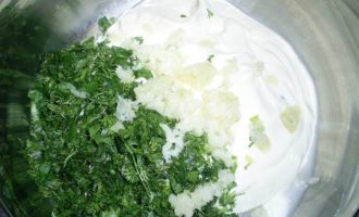 Для соуса сметану смешиваем с мелко нарезанной зеленью, лимонным соком, чесноком, пропущенным через пресс для чеснока. Все хорошенько перемешать, посолить и поперчить по вкусу.
