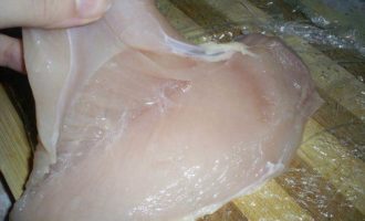Теперь займемся филе. Нам его надо будет надрезать поперек, развернуть как книжку и отбить. Теперь обо всем этом по порядку. Для начала отрезаем малое филе, оно нам пригодится, чтоб сделать заплатку, если филе порвется при отбивании.