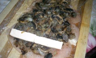 Приступаем к формированию рулетиков. На каждый выкладываем четвертую часть грибной начинки и брусочки плавленного сыра.
