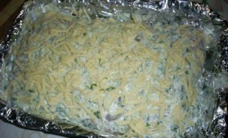 Посыпаем все тертым сыром и отправляем в разогретую до 200 градусов духовку. Запекаем примерно полчаса. Форму с готовым блюдом достать из духовки, затянуть фольгой и дать постоять 15 минут.