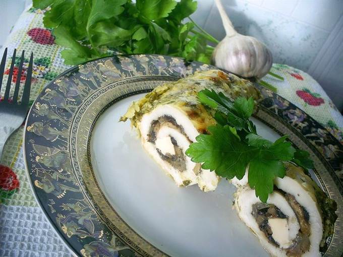 Сворачиваем все рулетиком и выкладываем в форму для запекания. Если у вас обычная, рекомендую ее предварительно выстелить фольгой в 2 слоя.
