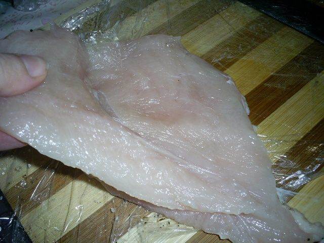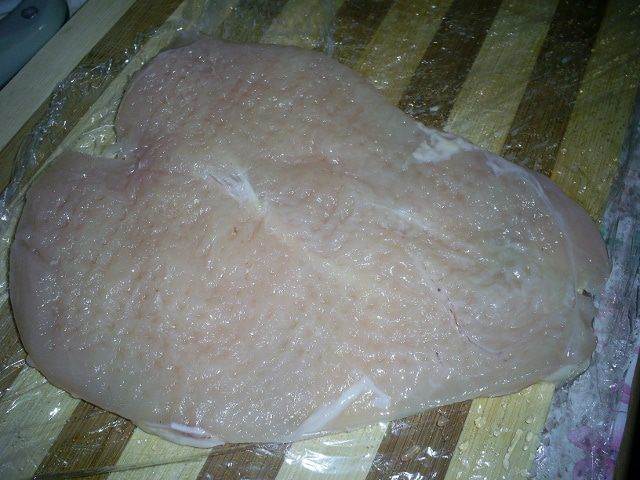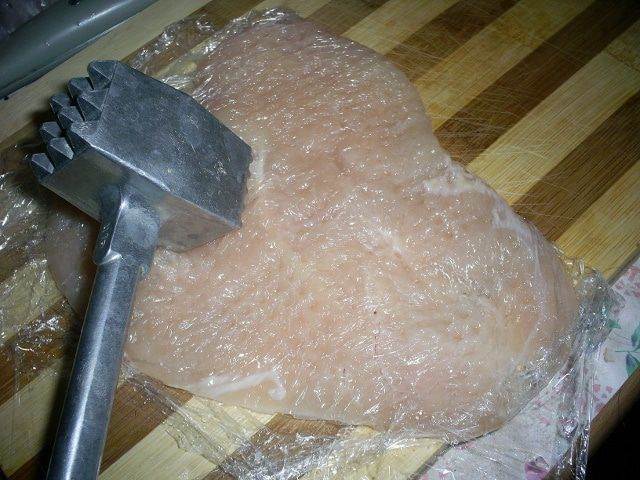 Теперь нам надо слегка отбить мясо. Удобно это сделать с помощью пищевой пленки. Застилаем разделочную доску пищевой пленкой, кладем подготовленное филе, накрываем пищевой пленкой и отбиваем его молотком.