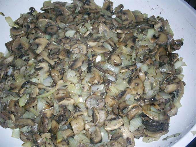Для начала приготовим начинку. Для этого шампиньоны моем, режем на пластинки, кладем на сковороду и жарим до испарения жидкости. Затем добавляем растительное масло, мелко нарезанный лук и жарим до готовности лука. Солим по вкусу и оставляем остывать.