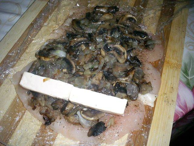 Приступаем к формированию рулетиков. На каждый выкладываем четвертую часть грибной начинки и брусочки плавленного сыра.