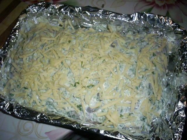 Посыпаем все тертым сыром и отправляем в разогретую до 200 градусов духовку. Запекаем примерно полчаса. Форму с готовым блюдом достать из духовки, затянуть фольгой и дать постоять 15 минут.