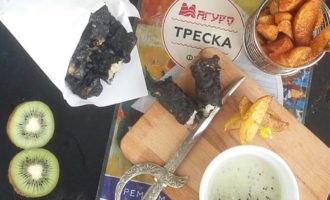 Филе трески ТМ «Магуро» нарезать порционными кусочками, присыпать морской солью и оставить на 5-10 минут. Затем промокнуть бумажным полотенцем. Параллельно можно приготовить соус-дип. Размять в блендере или вилкой очищенный киви, добавить размятый чеснок и домашний майонез. Можно добавить черного молотого перца.