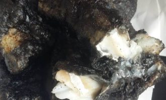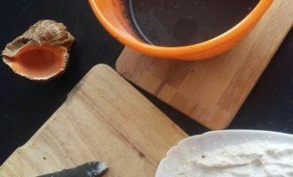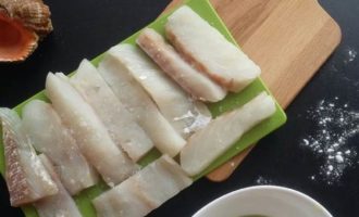 Приготовить кляр для рыбы. Для этого смешать пшеничную муку и крахмал тапиоки. Тапиока производится из тропического растения маниока и обладает лучшими свойствами, нежели обычный картофельный. Он сделает корочку более хрустящей. В холодное пиво добавить 1 ч. л. чернил каракатицы, перемешать и влить в сухую смесь. Размешать венчиком. Куски трески обвалять в муке, стряхнуть лишнюю и погрузить в кляр.