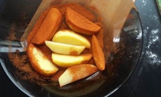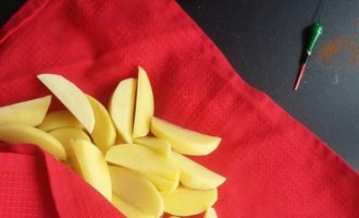Картофель очистить и нарезать ломтиками по-деревенски. Положить в холодную воду на 15-20 минут, чтобы ушел лишний крахмал. Обсушить полотенцем.