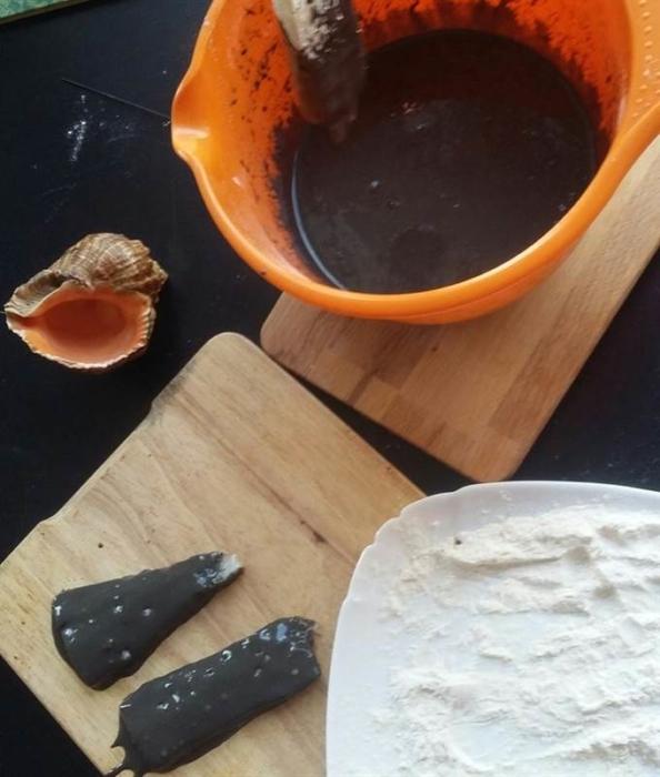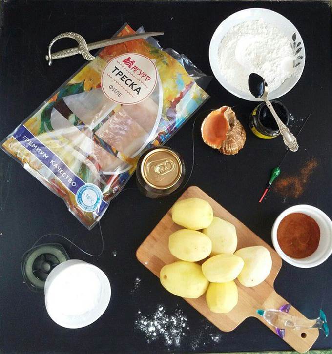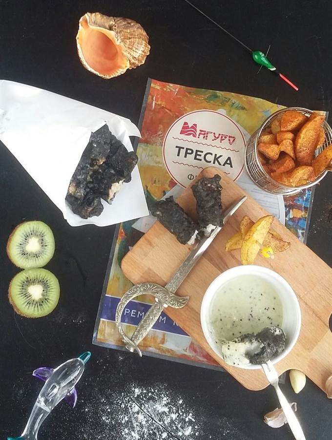 Приготовить кляр для рыбы. Для этого смешать пшеничную муку и крахмал тапиоки. Тапиока производится из тропического растения маниока и обладает лучшими свойствами, нежели обычный картофельный. Он сделает корочку более хрустящей. В холодное пиво добавить 1 ч. л. чернил каракатицы, перемешать и влить в сухую смесь. Размешать венчиком. Куски трески обвалять в муке, стряхнуть лишнюю и погрузить в кляр.