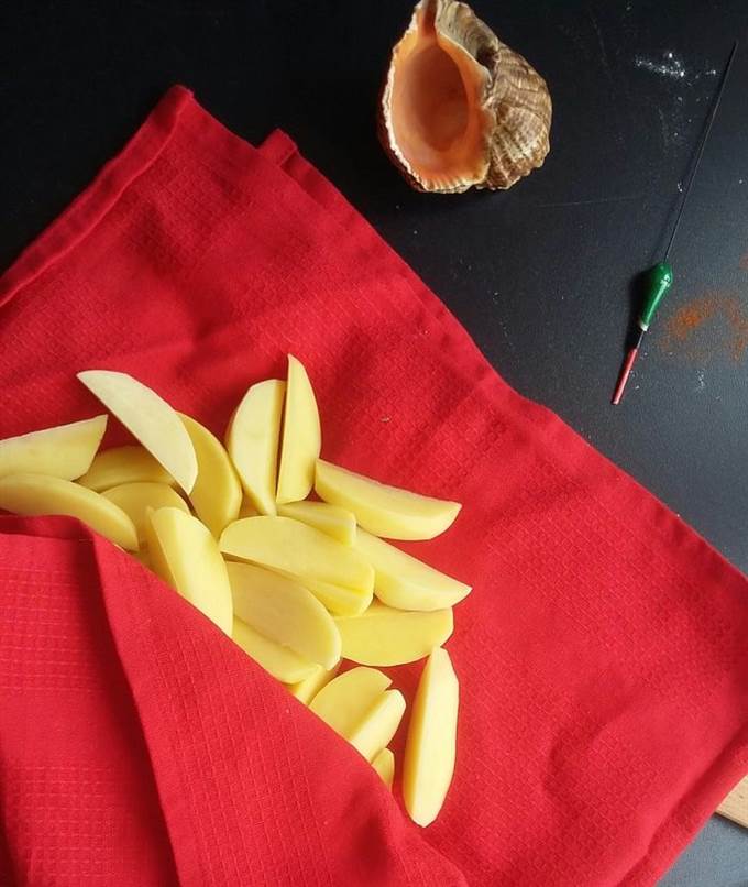 Картофель очистить и нарезать ломтиками по-деревенски. Положить в холодную воду на 15-20 минут, чтобы ушел лишний крахмал. Обсушить полотенцем.
