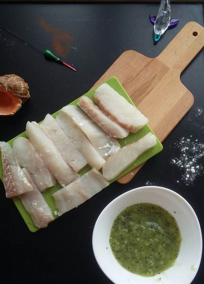 Филе трески ТМ «Магуро» нарезать порционными кусочками, присыпать морской солью и оставить на 5-10 минут. Затем промокнуть бумажным полотенцем. Параллельно можно приготовить соус-дип. Размять в блендере или вилкой очищенный киви, добавить размятый чеснок и домашний майонез. Можно добавить черного молотого перца.