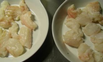 • В это время рыбное филе режем средними кусочками. Сбрызгиваем лимонным соком. У меня она уже в порционных формах для духовки.