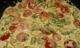 • Добавляем сметану и прогреваем все несколько минут. Солим, перчим по вкусу.