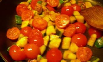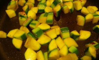 • Цукини режем крупными кубиками и обжариваем на оливковом масле минут 5.