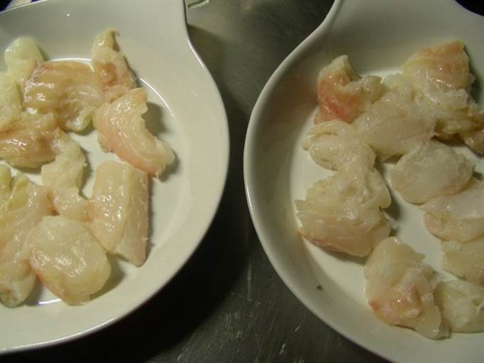 • В это время рыбное филе режем средними кусочками. Сбрызгиваем лимонным соком. У меня она уже в порционных формах для духовки.