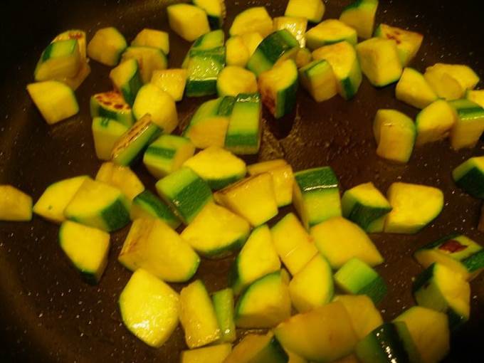 • Цукини режем крупными кубиками и обжариваем на оливковом масле минут 5.