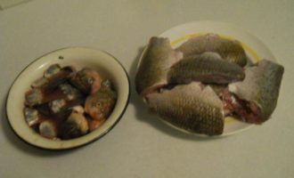 Чистим от чешуи, извлекаем внутренности, обрезаем плавники и головы.