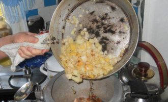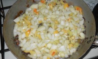 На сковородке слегка обжариваем на подсолнечном масле, нарезанные кубиками: лук, морковь и болгарский перец.