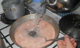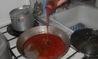 На сковородке слегка подогреваю томатный сок (собственного приготовления).