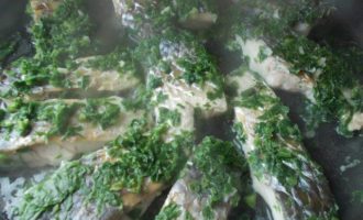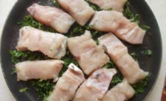 Укладываем на небольшую сковородку зелень равномерно, а сверху рыбку, кожей вниз, наливаем немножко водички, чтобы она только покрывала зелень, буквально несколько ложек. Солим и отправляем на средний огонь.