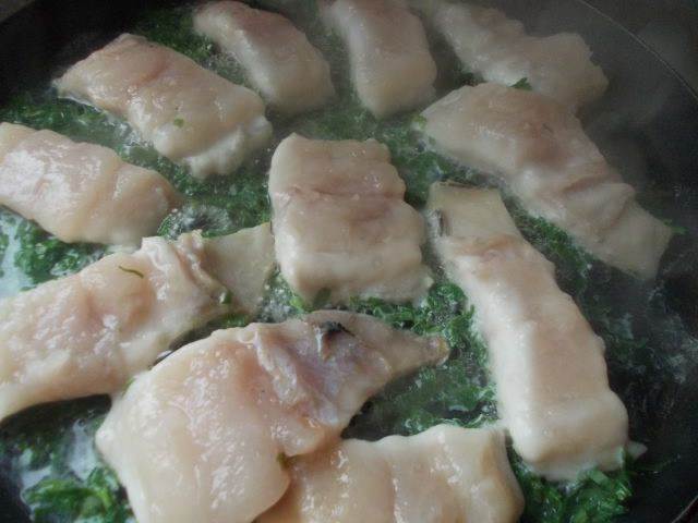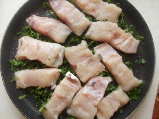 Укладываем на небольшую сковородку зелень равномерно, а сверху рыбку, кожей вниз, наливаем немножко водички, чтобы она только покрывала зелень, буквально несколько ложек. Солим и отправляем на средний огонь.