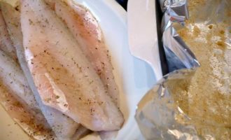 • Филе рыбы (если честно, то я впервые использовала филе судака, оно оказалось безумно костлявым, поэтому в следующий раз приготовлю это блюдо со своим любимым красным окунем) промоем, оботрем бумажным полотенцем, посолим, поперчим и посыпем орегано. Форму для запекания выложим двумя листами фольги внахлест. Смажем 1 ст.л. оливкового масла и посыпем сухарной крошкой.