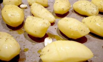• Кладем на противень, выложенный бумагой для выпечки, смазываем бумагу оливковым маслом. Посыпаем картофель орегано и сбрызгиваем лимонным соком. Выкладываем неочищенный чеснок, примерно 4 дольки (я зачем-то очистила). Сверху поливаем оставшимся оливковым маслом. Ставим в духовку на 50 минут.