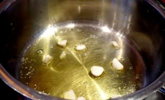 • Теперь займемся соусом для рыбы. В сотейнике разогреем оливковое масло (2 ст.л.) и поджарим на нем слегка чеснок.