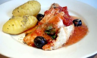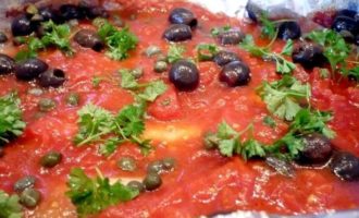 Рыбка, запеченная в томатном соусе с маслинами и каперсами