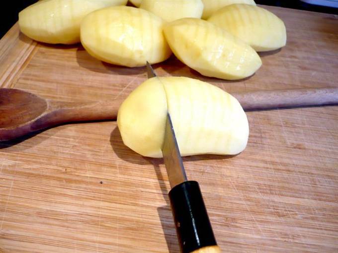 • Разогреем духовку до 200 градусов. Картофель очистим. Теперь надрежем каждый картофель поперек через каждые 5 мм, прикладывая при резке к каждой картофелине деревянную ложку и надрезая до тех пор, пока нож не коснется ложки. Каждую картофелину смазываем оливковым маслом (нам потребуется примерно 3 ст.л.) и посыпаем солью.