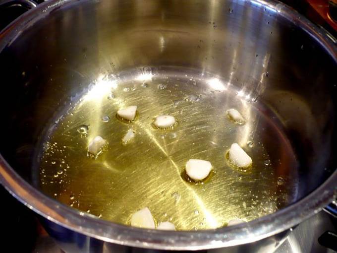 • Теперь займемся соусом для рыбы. В сотейнике разогреем оливковое масло (2 ст.л.) и поджарим на нем слегка чеснок.
